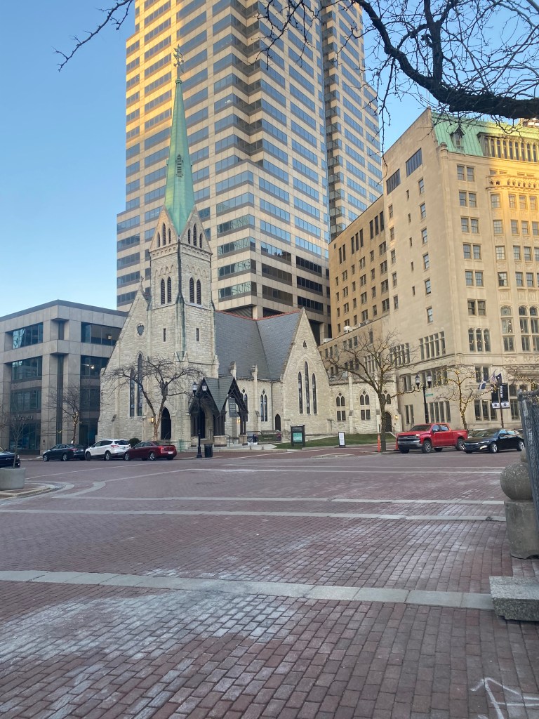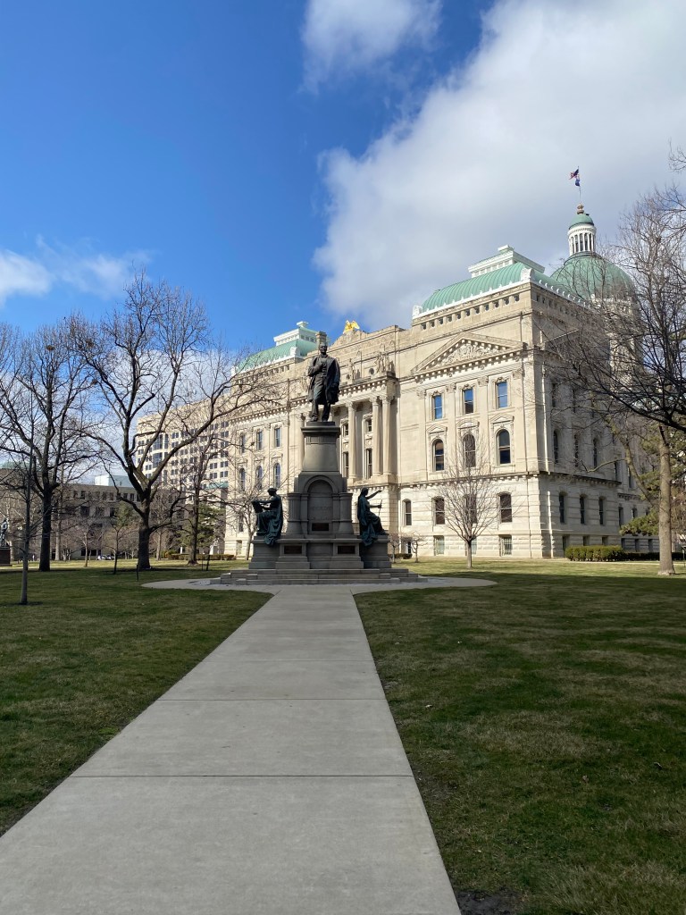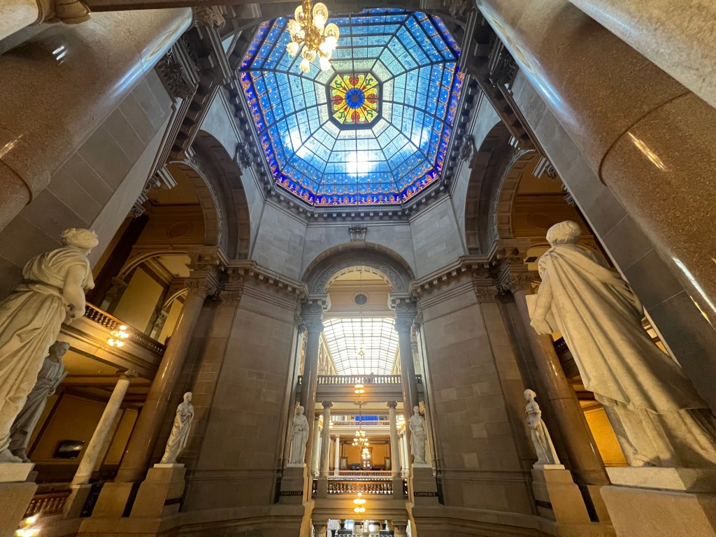 After we had been fueled, our first stop of the day was the Indiana State Capitol. I’ve visited my fair share of state capitols and Indiana’s is very nice. They have a beautiful blue stained glass ceiling on the inside of the dome which allowed for the crisp winter light to shine through. Many couples seemed to be following with our Valentine’s Day themed celebration in Indianapolis, as we saw many partners getting married in the statehouse. We also witnessed the meeting of a local NAACP chapter, which was cool to see in person.